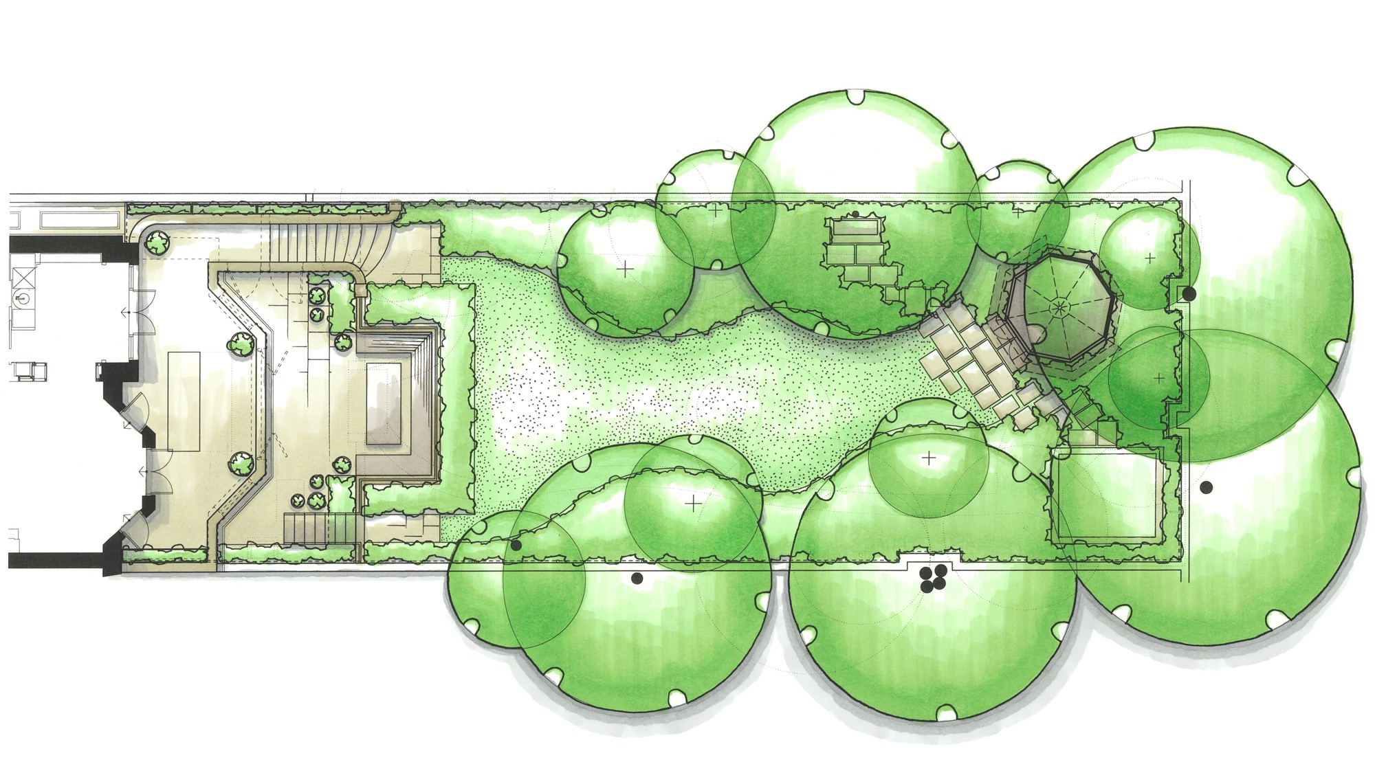 A chic woodland garden in the centre of London with a sinuous central lawn and large borders leading to a charming naturalistic pavilion to the rear. The garden also includes a detailed trellis design to the lower facade of the property and terraces which continues the length of the garden for additional privacy.